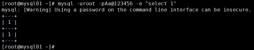 MYSQL_PWD='Aa@123456' mysql -u root -e "select 1"