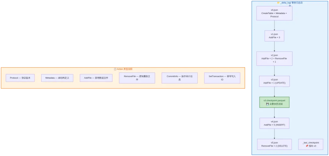 这个设计的精妙之处在于:数据文件本身是不可变的 Parquet 文件,所有的"增删改"都只是在事务日志里追加新的 Action。DELETE 不会真的删文件,UPDATE 是"删旧文件 + 加新文件"。