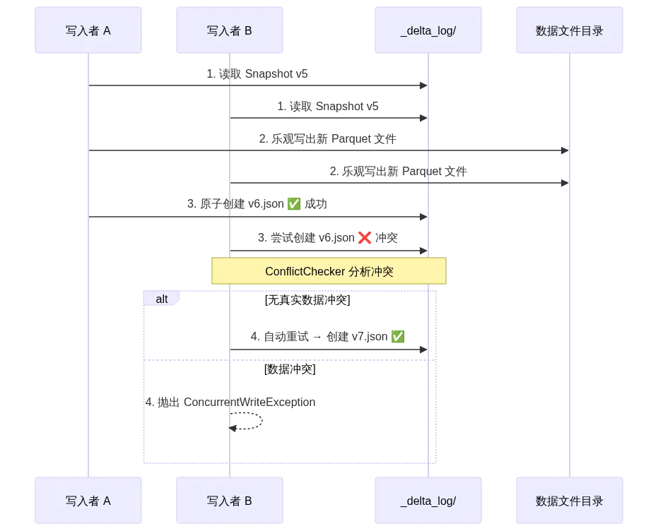 核心实现在 OptimisticTransaction.scala。源码中的 ConflictChecker 非常聪明——它不会一刀切地拒绝所有并发写入,而是精确分析冲突范围: