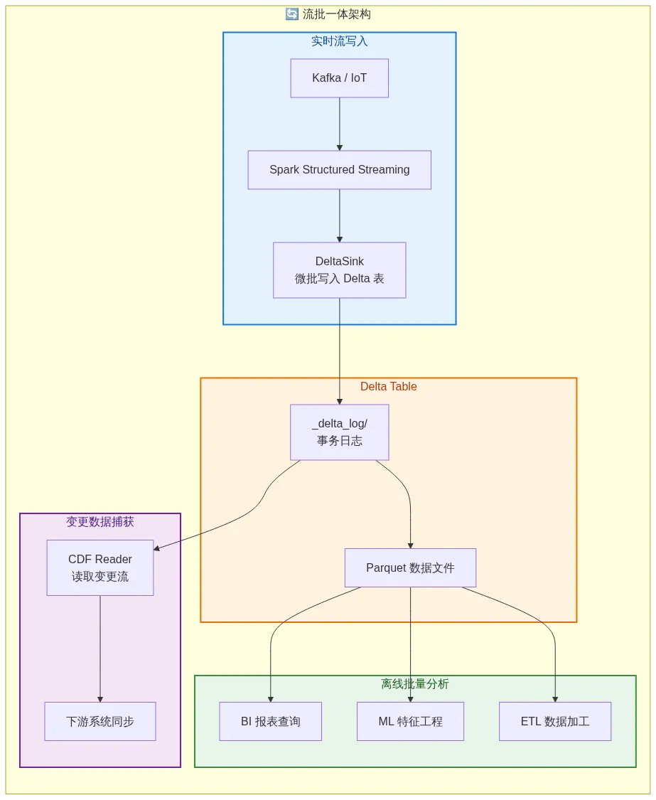 这是 Delta Lake 最杀手级的场景。源码中的 DeltaSource(Structured Streaming Source)和 DeltaSink(Streaming Sink)实现了完整的流批一体: