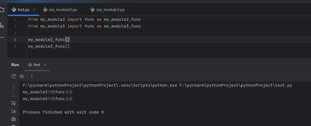 from my_module2 import func as my_module2_funcfrom my_module3 import func as my_module3_funcmy_module2_func()my_module3_func()