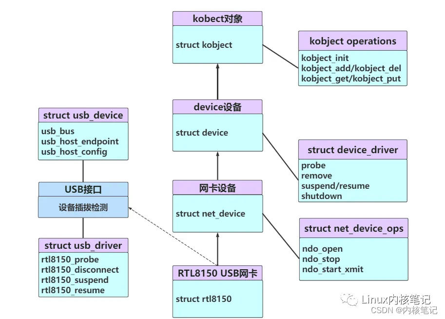 以Linux内核中的RTL8150 USB网卡驱动源码为例:我们把以usb_device为基类的这条继承分支当作一个接口来处理,USB网卡通过usb_device封装的接口可以实现USB网卡设备的插拔检测、底层数据传输等功能。而对于以net_device为基类的这路继承,我们把它看作一个普通的单继承关系,USB网卡以kobject为基类,实现多级继承,每一级的基类都扩展了各自的方法或封装了接口,供其子类RTL8150调用。RTL8150网卡通过调用祖父类kobject的方法kobject_add()将设备注册到系统;通过调用device类的probe()完成驱动和设备的匹配及设备的suspend、shutdown等功能;通过调用net_device类实现的open、xmit、stop等接口完成网络设备的打开、数据发送、数据停止发送等功能。
