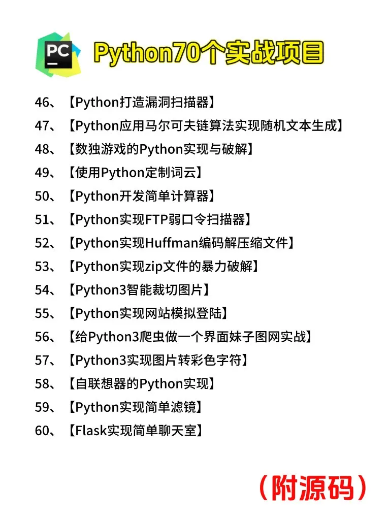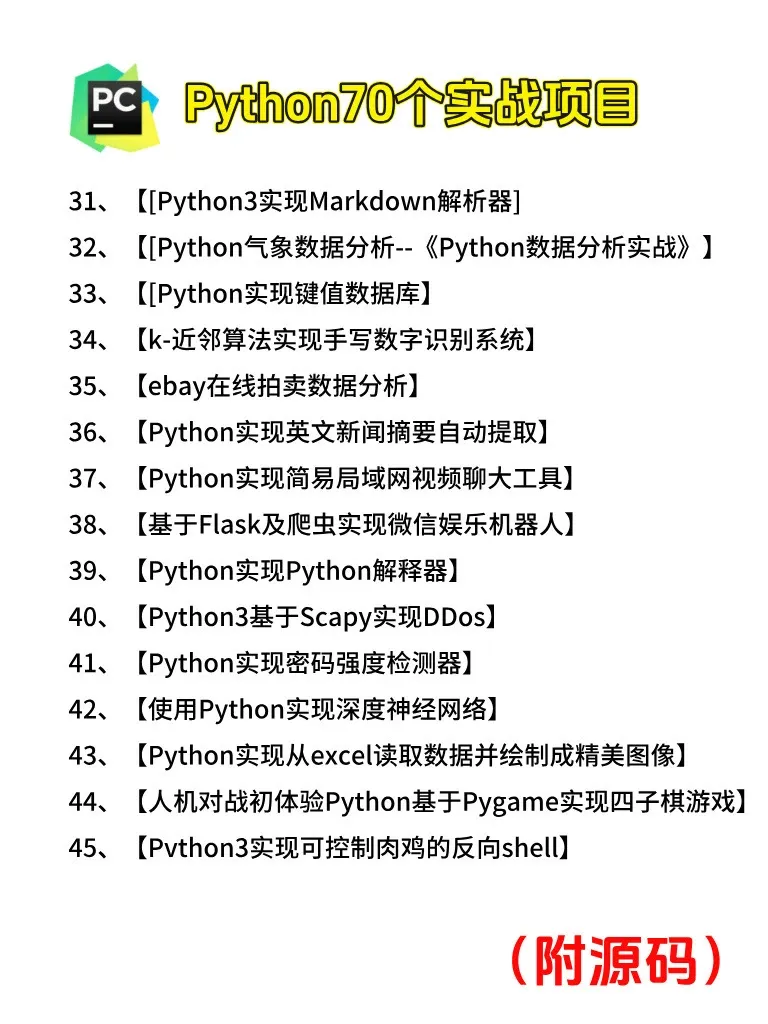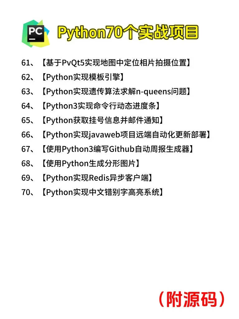 💞这85个Python 实战项目。难度不高,适合小白入门练手~可以选择自己感兴趣的项目进行学习。也可以从中寻找灵感去做自己的项目。