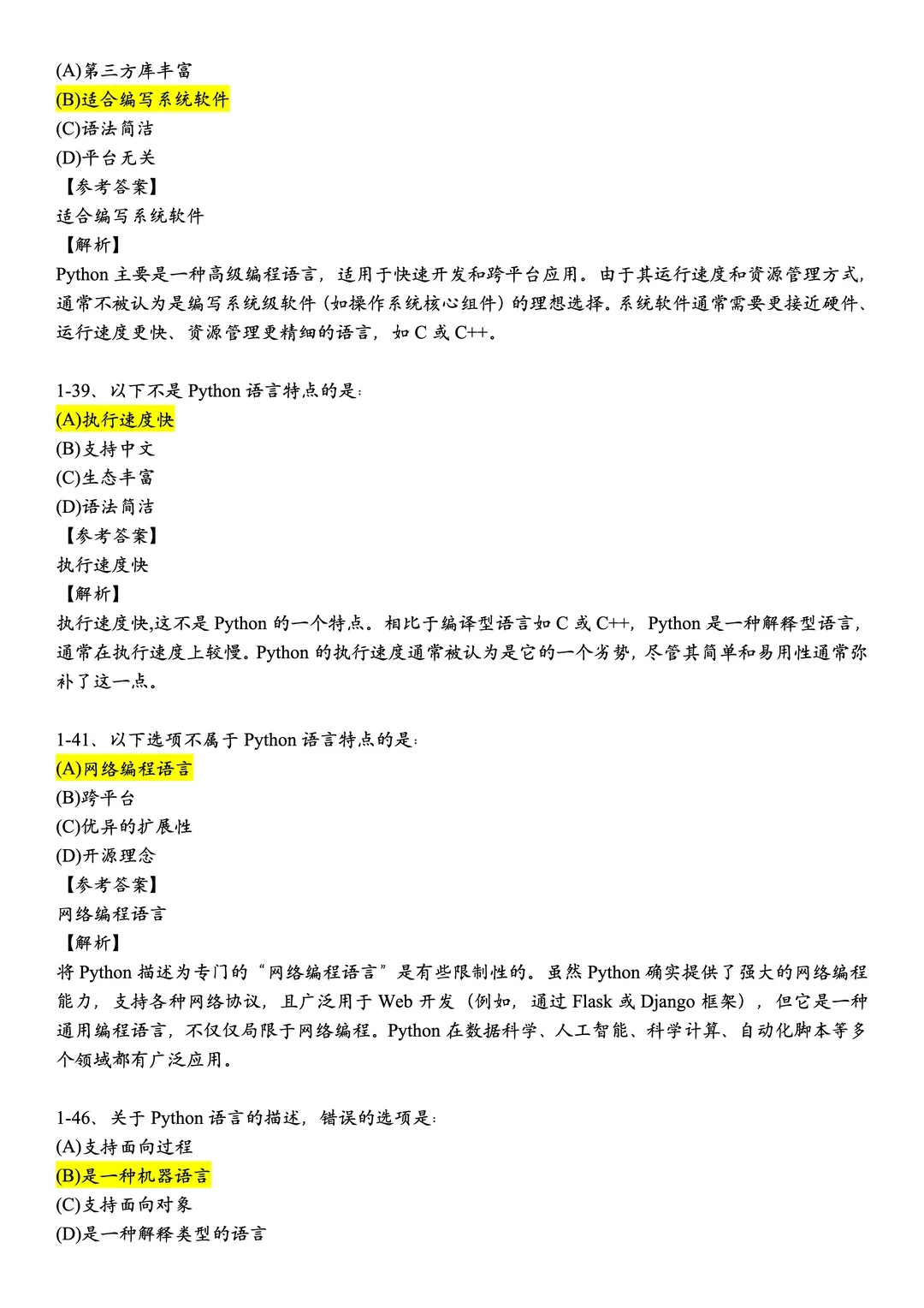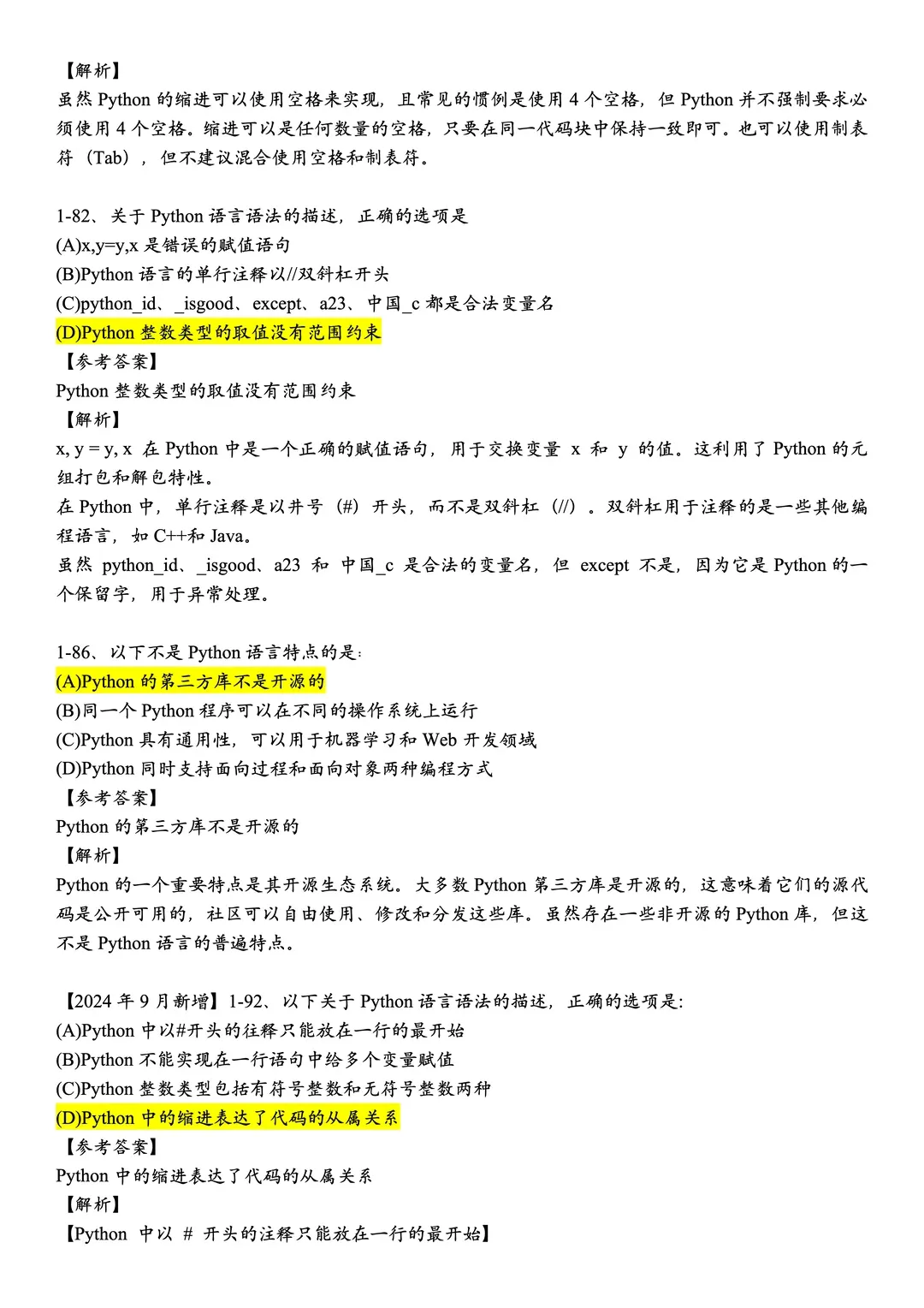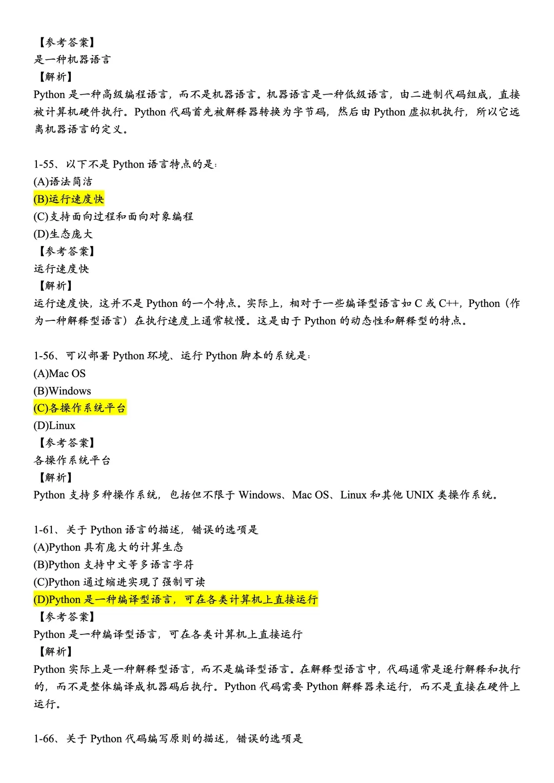 【解析】Python 是一种解释型语言,其代码通常是逐行执行的,而非一次性编译成目标代码然后执行。Python 解释器逐行读取 Python 代码,将其转换成字节码,然后执行这些字节码。这与编译型语言不同,后者会先将整个程序编译成机器代码,然后执行这个编译后的程序。