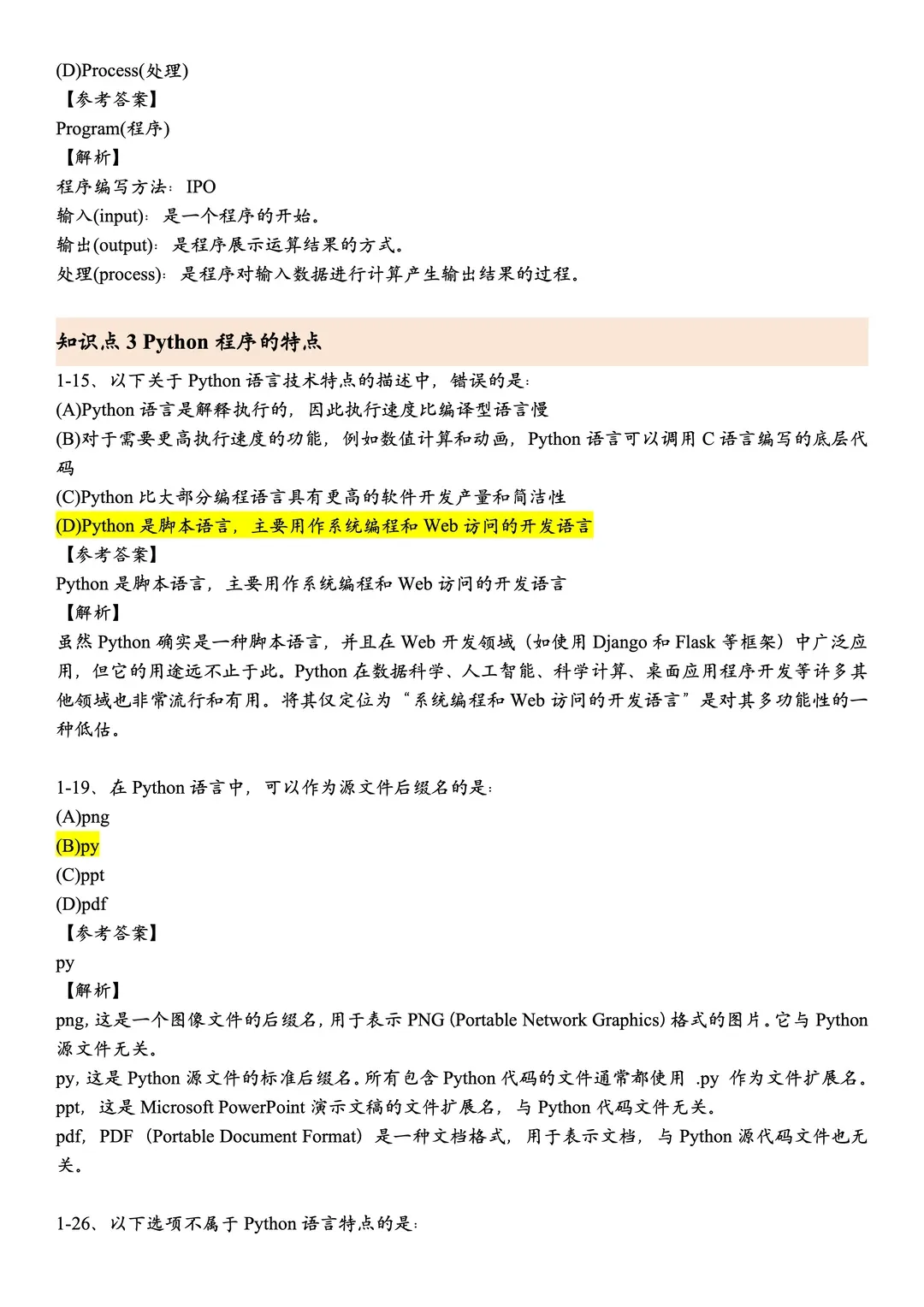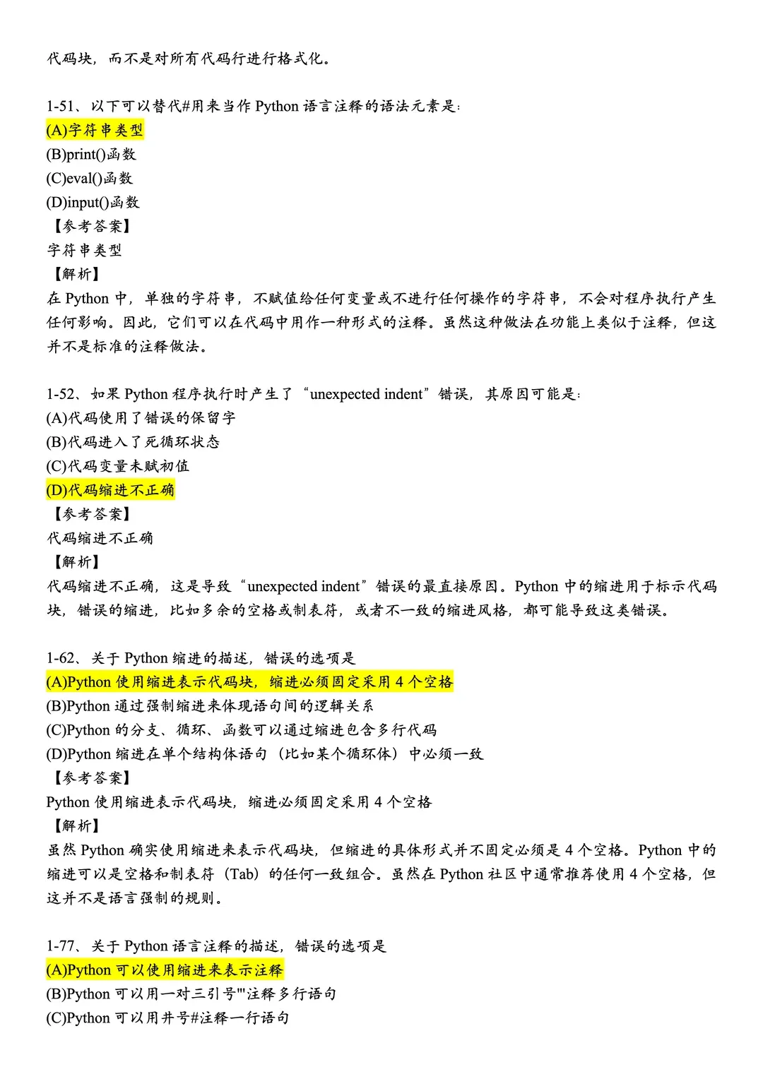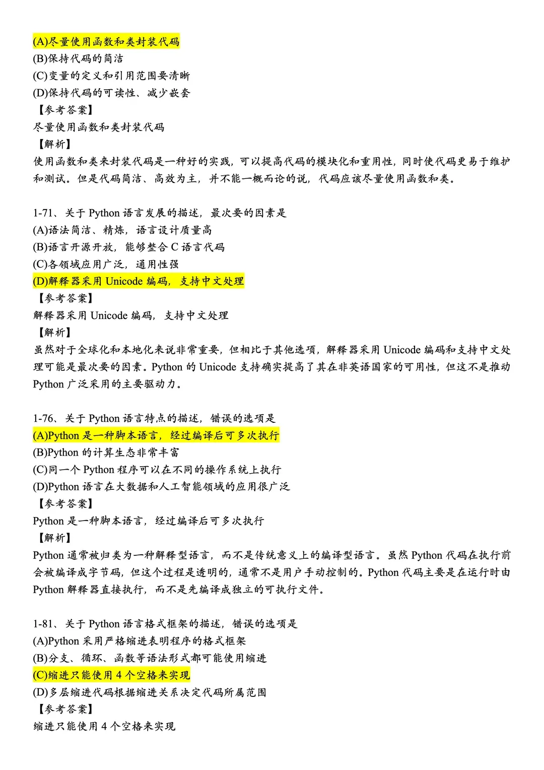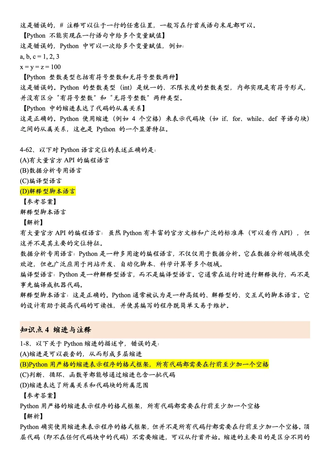 【解析】Python 是一种解释型语言,其代码通常是逐行执行的,而非一次性编译成目标代码然后执行。Python 解释器逐行读取 Python 代码,将其转换成字节码,然后执行这些字节码。这与编译型语言不同,后者会先将整个程序编译成机器代码,然后执行这个编译后的程序。