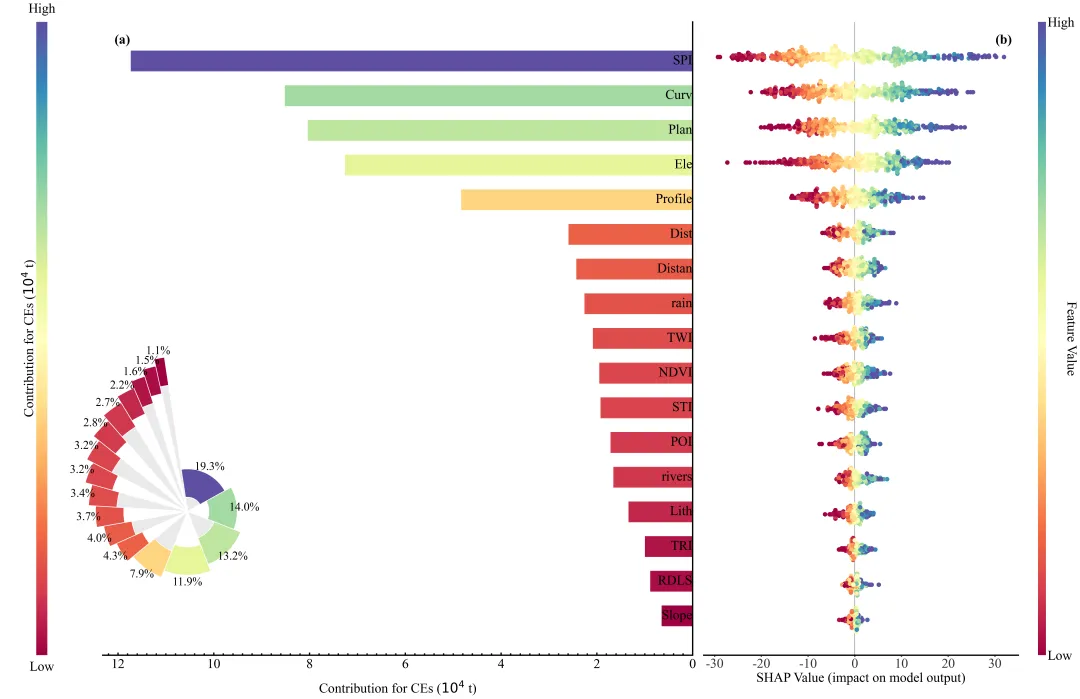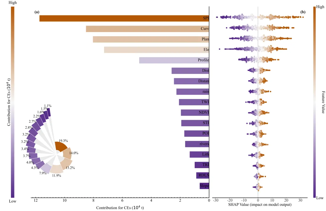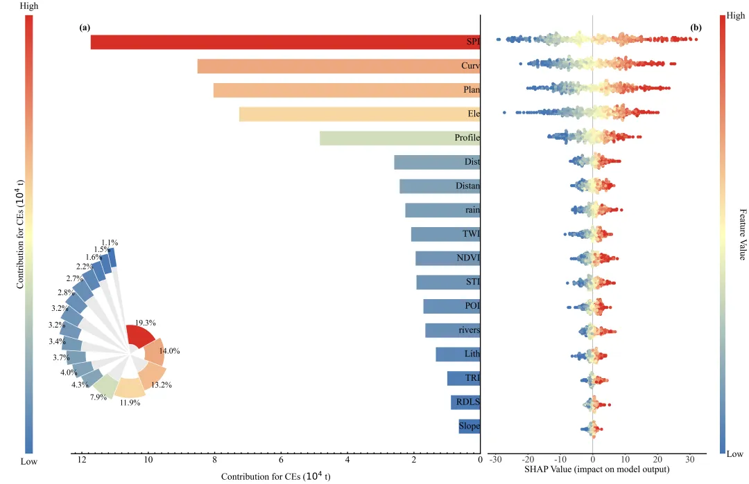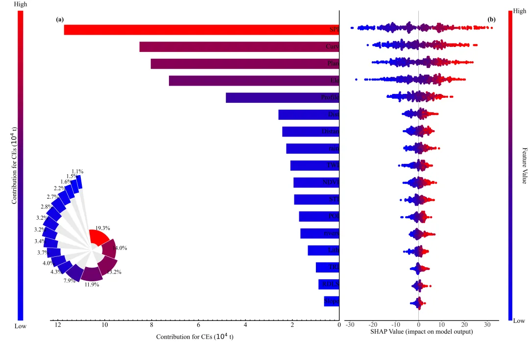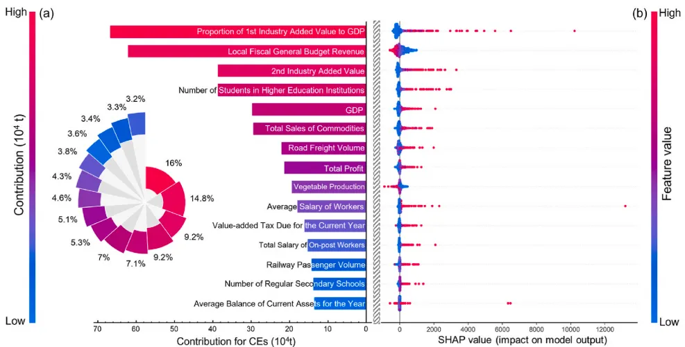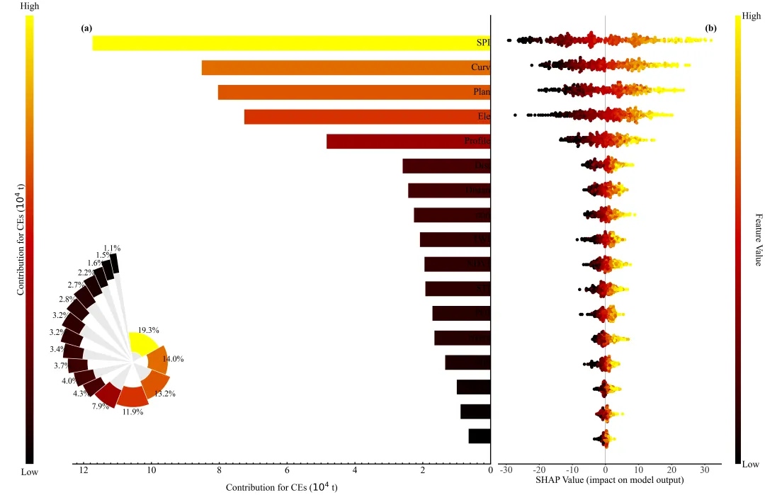 # =========================================================================================# ======================================6.特征重要性条形图+蜂巢图+玫瑰图组合图绘制函数=======================================# =========================================================================================def draw_combined_plot(sorted_features, sorted_shap_values, shap_values, bar_colors, cmap, color_norm):# 创建画布fig_combined = plt.figure(figsize=(34, 25))# 定义边距和间距参数left_margin, right_margin, bottom_margin, top_margin = 0.05, 0.05, 0.02, 0.1space_between = 0.01# 左右子图之间的间距plot_bottom = bottom_margin# 绘图区域的底部plot_height = 1 - bottom_margin - top_margin# 绘图区域的高度total_plot_width = 1 - left_margin - right_margin - space_between# 宽度# 颜色条坐标轴ax_cbar_new = fig_combined.add_axes([cbar_left, plot_bottom, colorbar_width, plot_height])# 创建ScalarMappable对象,用于颜色映射sm = ScalarMappable(cmap=cmap, norm=color_norm)# 绘制颜色条cbar = fig_combined.colorbar(sm,cax=ax_cbar_new,orientation='vertical')# 设置标签cbar.set_label('', size=18, labelpad=5)# 移除刻度cbar.set_ticks([])# 设置刻度位置# 去掉边框cbar.outline.set_visible(False)# 颜色条标题ax_cbar_new.text(-1.4, # x坐标0.5, # y坐标'Contribution for CEs ($10^4$ t)', # 文本内容transform=ax_cbar_new.transAxes, # 使用相对坐标fontsize=30, # 字体大小rotation=90,# 旋转90度va='center')# 左侧条形图的位置main_ax_left = cbar_left + colorbar_width + 0.05# 添加条形图坐标轴ax_bar_new = fig_combined.add_axes([main_ax_left,#左plot_bottom, # 下left_plot_width, # 宽度plot_height]) # 高度# x轴刻度在底部ax_bar_new.xaxis.tick_bottom()# 设置x轴标签ax_bar_new.xaxis.set_label_position("bottom")# 反转x轴ax_bar_new.invert_xaxis()# 绘制水平条形ax_bar_new.barh(y=range(len(sorted_features)), # 数据width=sorted_shap_values, # 条形宽度color=bar_colors, # 颜色height=0.6) # 条形高度# 反转y轴ax_bar_new.invert_yaxis()# 设置x轴标题ax_bar_new.set_xlabel('Contribution for CEs ($10^4$ t)',size=30, labelpad=20)ax_bar_new.spines['right'].set_visible(True)ax_bar_new.spines['bottom'].set_visible(True)# 主刻度样式ax_bar_new.tick_params(axis='x',#轴which='major', # 主刻度direction='in', # 朝内labelsize=30, # 标签大小length=6, # 刻度长度# 图标签ax_bar_new.text(0.02,# x坐标0.98, # y坐标'(a)', # 文本内容transform=ax_bar_new.transAxes, # 使用相对坐标fontsize=30, # 字体大小weight='bold', # 字体加粗ha='left', # 水平左对齐va='top') # 垂直顶部对齐