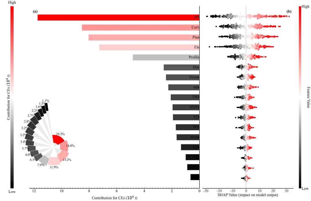 ax_bar.xaxis.tick_bottom()# 条形图x轴刻度位置ax_bar.xaxis.set_label_position("bottom")# 设置x轴标签位置# 反转x轴方向ax_bar.invert_xaxis()# 绘制水平条形图ax_bar.barh(y=range(len(sorted_features)), # Y坐标width=sorted_shap_values, # 水平条形宽度color=bar_colors, # 条形颜色height=0.6) # 条形高度# 反转y轴方向,使最重要的特征排在顶部ax_bar.invert_yaxis()# 设置x轴标签ax_bar.set_xlabel('Contribution for CEs ($10^4$ t)', size=24, labelpad=20)# 移除y轴刻度ax_bar.set_yticks([])# 去掉左侧和顶部边框ax_bar.spines[['left', 'top']].set_visible(False)# 设置右侧边框位置ax_bar.spines['right'].set_position(('data', 0))# 显示边框ax_bar.spines['right'].set_visible(True)ax_bar.spines['bottom'].set_visible(True)# 设置x轴主刻度样式ax_bar.tick_params(axis='x', # X轴which='major', # 应用于主刻度direction='in', # 朝内labelsize=24, # 刻度标签字体大小length=6, # 刻度线长度pad=8) # 标签与刻度线之间的距离# 子图标签ax_bar.text(0.02,0.98,'(a)',transform=ax_bar.transAxes,fontsize=30,weight='bold',ha='left',va='top')