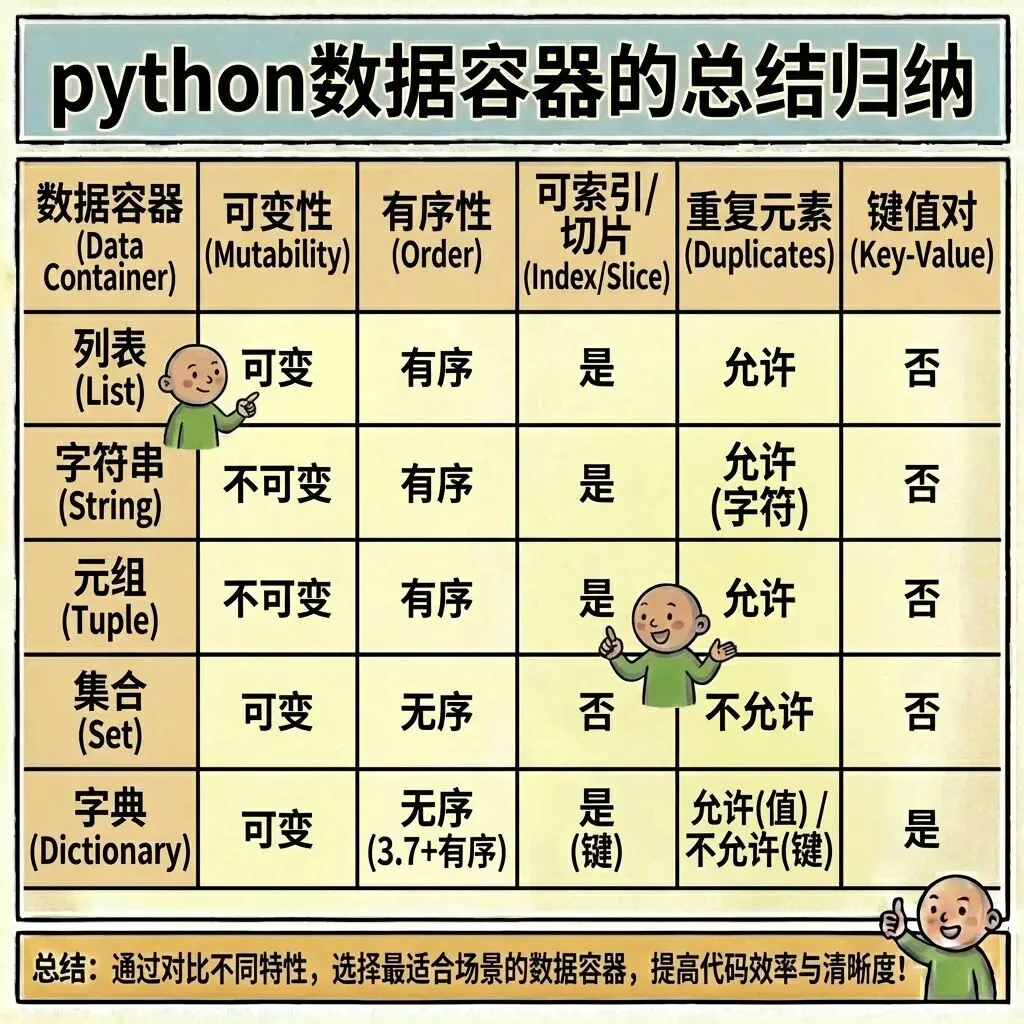 温故而知新,有效归纳可以提高我们的认知效率。今天的基础篇内容非常简单:将先前所学的python数据容器做一个汇总归纳,整理一下,有一个更清楚的认识,大家这么聪明,一看就会了。