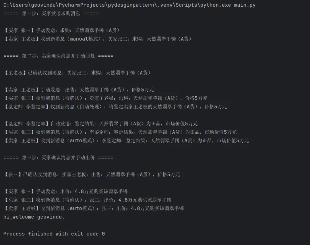 # encoding: utf-8# 版权所有 2026 ©涂聚文有限公司™ ®# 许可信息查看:言語成了邀功盡責的功臣,還需要行爲每日來值班嗎# 描述:中介者模式(Mediator Pattern)# Author : geovindu,Geovin Du 涂聚文.# IDE : PyCharm 2024.3.6 python 3.11# os : windows 10# database : mysql 9.0 sql server 2019, postgreSQL 17.0 Oracle 21c Neo4j# Datetime : 2026/2/27 22:19# User : geovindu# Product : PyCharm# Project : pydesginpattern# File : MediatorBll.pyfrom MediatorPattern.Buyer import Buyerfrom MediatorPattern.Seller import Sellerfrom MediatorPattern.Appraiser import Appraiserfrom MediatorPattern.JewelryExchange import JewelryExchangefrom MediatorPattern.Message import Message# ====================== 测试代码 ======================class MediatorBll(object): """ """ def demo(self): """ :return: """ # 1. 创建中介者和角色 exchange = JewelryExchange() buyer_zhang = Buyer(exchange, "张三") seller_wang = Seller(exchange, "王老板") appraiser_li = Appraiser(exchange, "李鉴定师") exchange.register_buyer(buyer_zhang) exchange.register_seller(seller_wang) exchange.register_appraiser(appraiser_li) # 2. 第一步:买家发送求购(人为模式,需确认后回复) print("===== 第一步:买家发送求购消息 =====") buy_msg = Message( sender=buyer_zhang.name, receiver="全体卖家", content="求购:天然翡翠手镯(A货)", send_mode="manual" ) buyer_zhang.send_message(buy_msg) # 3. 第二步:卖家收到求购消息,先确认,再手动回复出售消息 print("\n===== 第二步:卖家确认消息并手动回复 =====") # 卖家确认第0条收到的消息 seller_wang.confirm_message(0) # 卖家手动发送出售回复 sell_msg = Message( sender=seller_wang.name, receiver="全体买家", content="出售:天然翡翠手镯(A货),价格5万元", send_mode="manual" ) seller_wang.send_message(sell_msg) # 4. 第三步:买家收到出售消息,确认后手动出价 print("\n===== 第三步:买家确认消息并手动出价 =====") # 买家确认第0条收到的消息(出售消息) buyer_zhang.confirm_message(0) # 买家手动发送出价回复 bid_msg = Message( sender=buyer_zhang.name, receiver="王老板", content="出价:4.8万元购买该翡翠手镯", send_mode="manual" ) buyer_zhang.send_message(bid_msg)