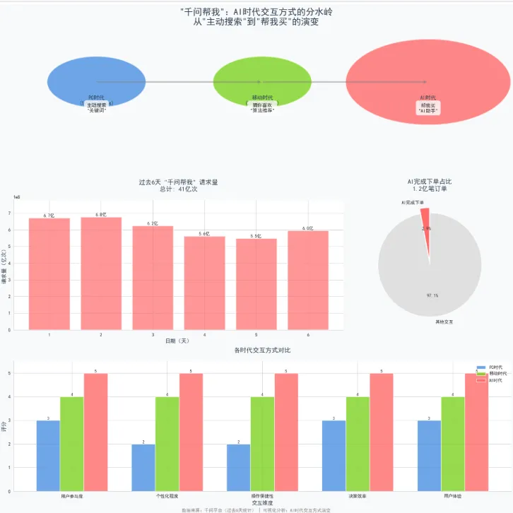千问"动嘴不动手":过去6天,用户说了41亿次"千问帮我",AI完成下单超1.2亿笔。这不仅仅是数据,更是用户习惯的分水岭——从PC时代的"主动搜索"、移动时代的"猜你喜欢",到AI时代的"帮我买",交互方式正在被重塑。