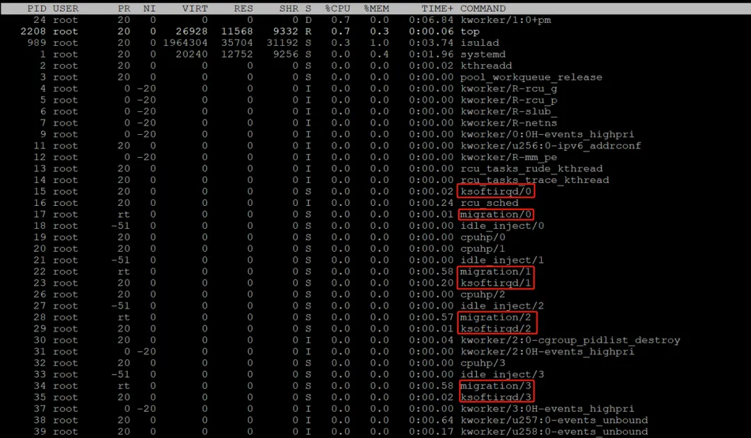 load average: 0.00, 0.12, 0.16是 CPU 忙不忙,不是几核。- 看 ksoftirqd/0、1、2、3 → 知道是 4 核
