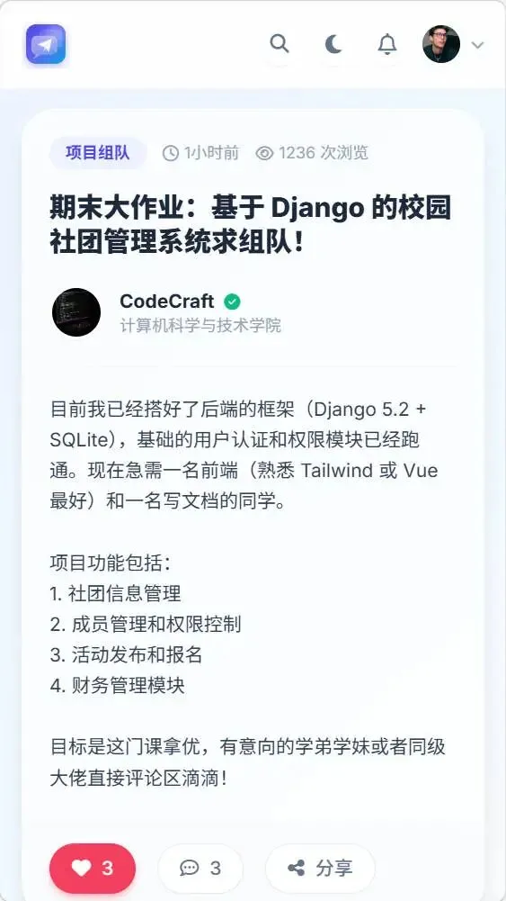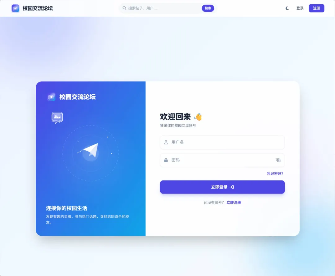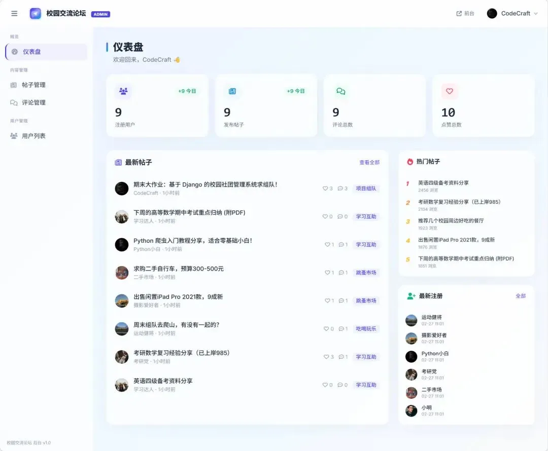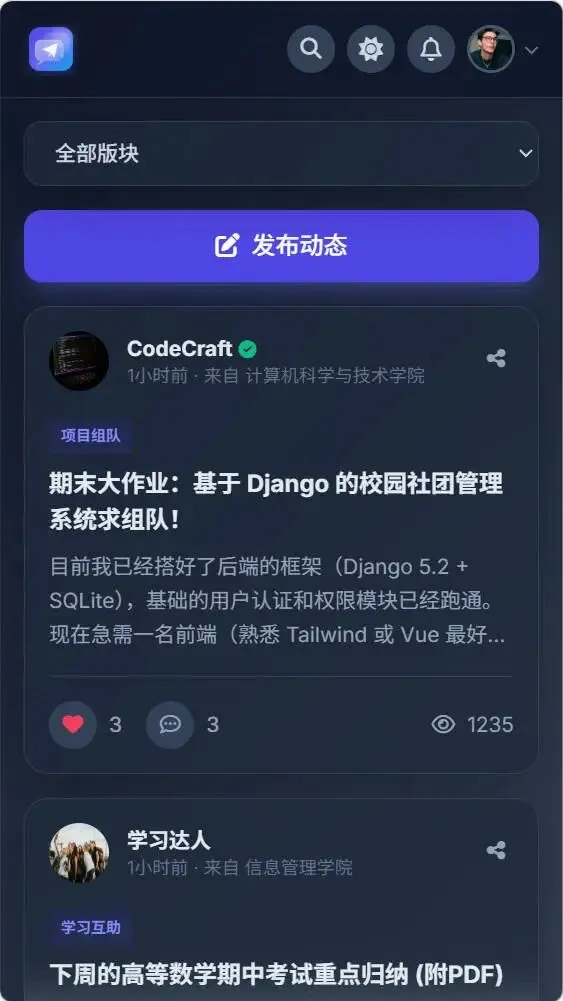 校园交流论坛是一个基于 Python Flask 开发的校园交流论坛,专业设计的精美ui界面,前后台功能完整,支持 PC 与移动端自适应,内置 WebSocket 实时通知。