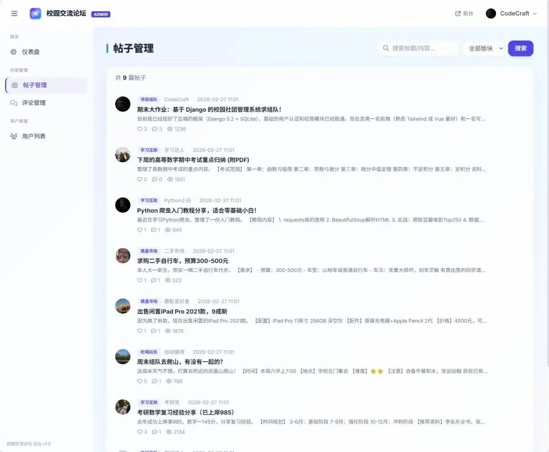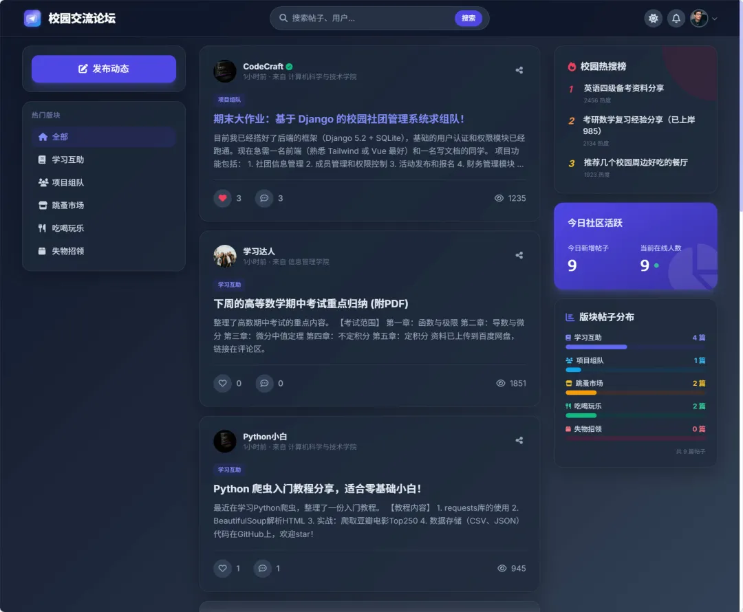 - 15个帖子 - 分布在6个版块(学习互助、项目组队、跳蚤市场、吃喝玩乐、失物招领、其他)