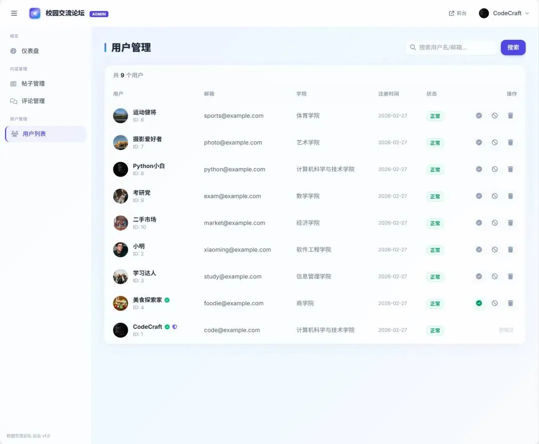 所有用户头像都来自Unsplash高质量图片库,帖子内容贴近校园生活实际。详细数据说明请查看 数据说明.md 文件。