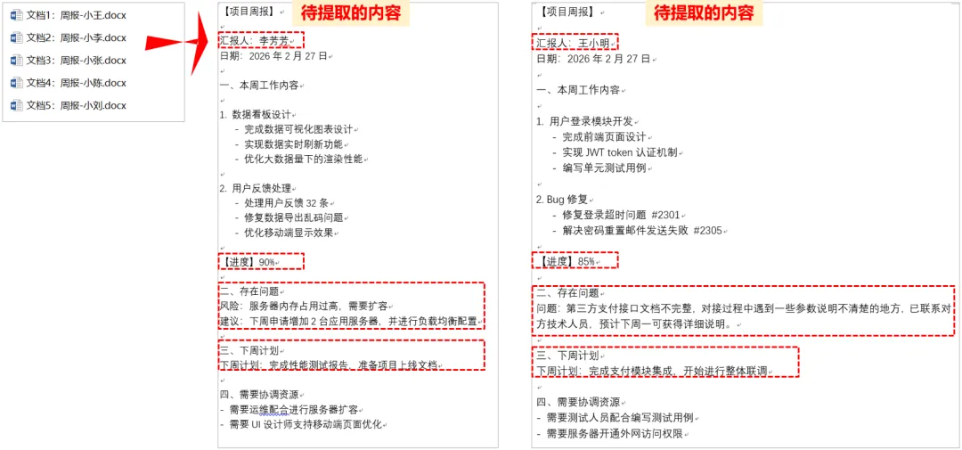 📁 项目文档/ → 📄 信息汇总表.xlsx├── 文档1:周报-小王.docx ├── 文档2:周报-小李.docx ├── 姓名 | 本周进度 | 存在问题 | 下周计划└── 文档3:周报-小张.docx └── 小王 | 90% | 无 | 测试上线