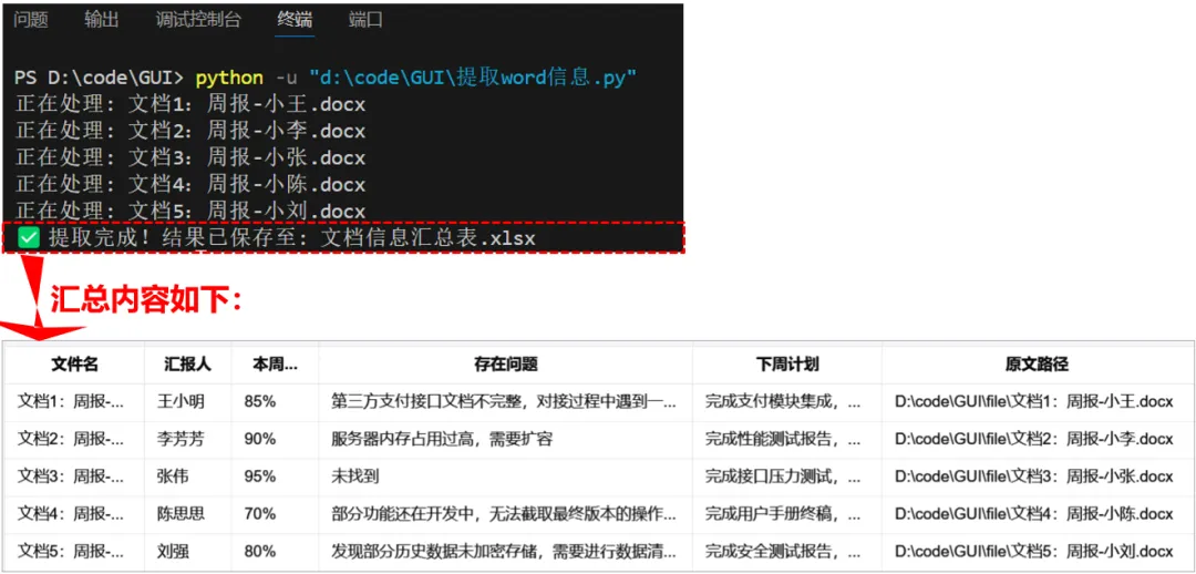 def batch_extract_to_excel(): keywords = {"汇报人": r"汇报人[::]\s*([^\n]+)","本周进度": r"【进度】\s*([^\n]+)","存在问题": r"(?:问题|风险)[::]\s*([^\n]+)","下周计划": r"下周计划[::]\s*([^\n]+)" }# 创建Excel wb = Workbook() ws = wb.active ws.title = "信息汇总" headers = ["文件名"] + list(keywords.keys()) + ["原文路径"] ws.append(headers)# 遍历处理所有Word文档for filename in os.listdir("项目文档"):if not filename.endswith(".docx"):continue file_path = os.path.join("项目文档", filename)print(f"正在处理: {filename}")# 提取信息并写入Excel data = extract_info_from_docx(file_path, keywords) data["原文路径"] = os.path.abspath(file_path) ws.append([data.get(h, "") for h in headers])# 保存结果 wb.save("文档信息汇总表.xlsx")# 执行批量提取batch_extract_to_excel()