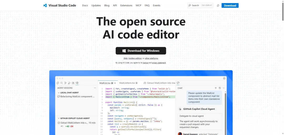 打开官网https://code.visualstudio.com/,页面会自动识别你的系统,直接点下载按钮就行,Windows 选 64 位安装包,Mac 选对应芯片的版本(Intel/Apple Silicon)。