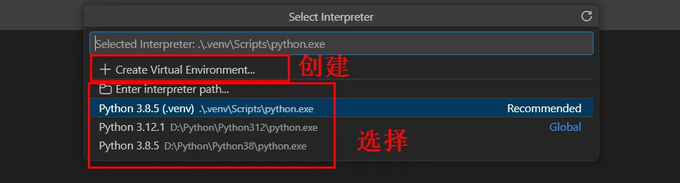 下拉列表里会显示电脑里所有的 Python 解释器,包括系统自带的和各个虚拟环境的,选你想用于当前项目的那个就行,选完后 VS Code 会自动在项目里生成.vscode文件夹,保存解释器配置,下次打开直接用。