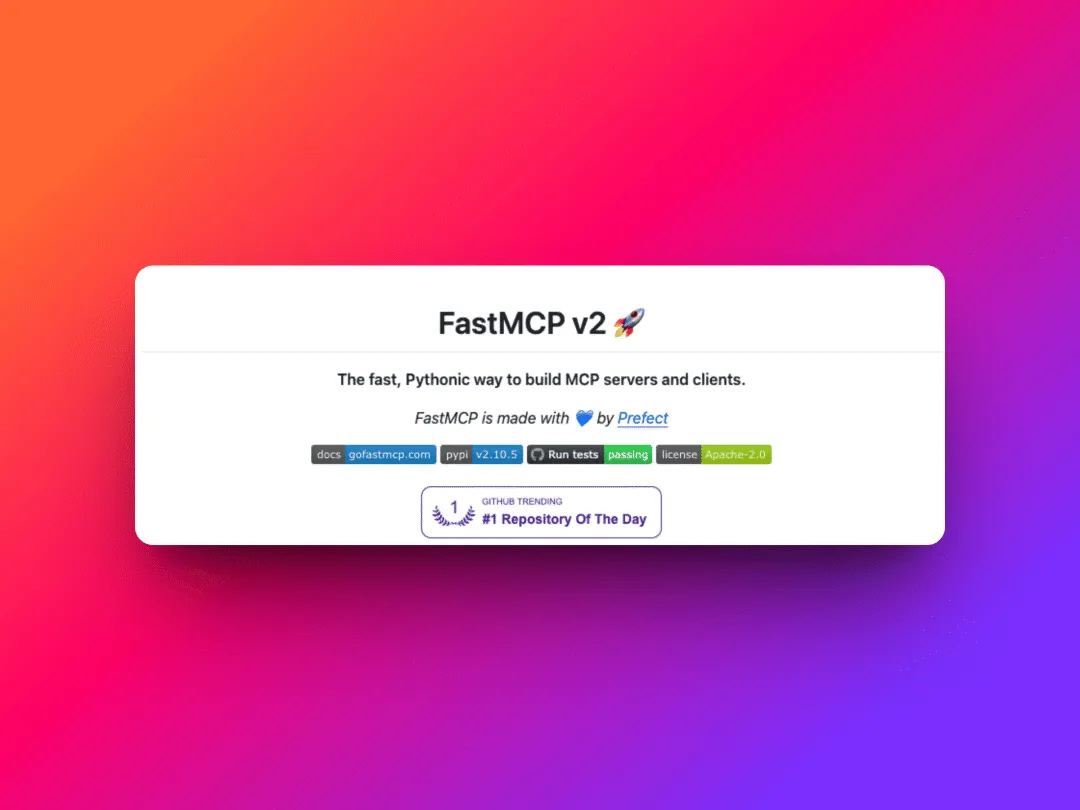 这是FastMCP 2.0,这是一个积极维护的版本,为处理MCP生态系统提供了一个完整的工具包,具有一套全面的功能,远超核心MCP规范,所有这些都在为提供通往生产的最简单路径服务。这包括部署、认证、客户端、服务器代理和组合、从REST API生成服务器、动态工具重写、内置测试工具、集成等。