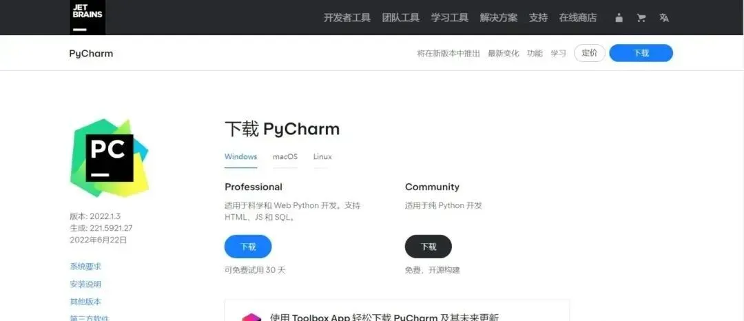 本文将使用 PyCharm Community Edition 2021.1 版本,该版本仅有30天免费且可在所有主流平台上使用。
