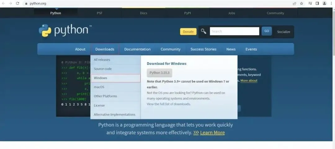 (1)首先安装在python 官网安装python环境(https://www.python.org/getit/)(2)选择Downloads--Windows点开,如图所示: