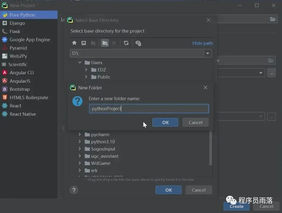 项目其实就是建一个工程或者文件,它默认是帮我们安装到C盘的,同样的我们还是自定义换个位置。在这里我们还是选择D盘,然后新建一个python project。