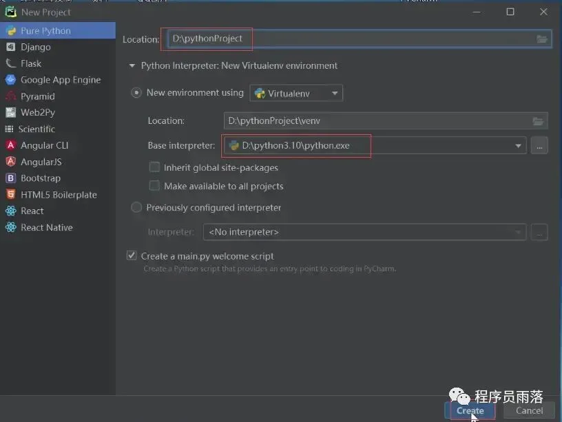当上述步骤都完成后,因为我们之前已经安装好了解释器,下图中就可以看的python解释器自动加载到了P有charm里面了,最后直接点创建就好了。