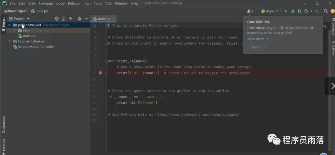 就这样Python工程文件就已经建好了,可以看到下图自动帮我们生成了一段含有代码的界面。