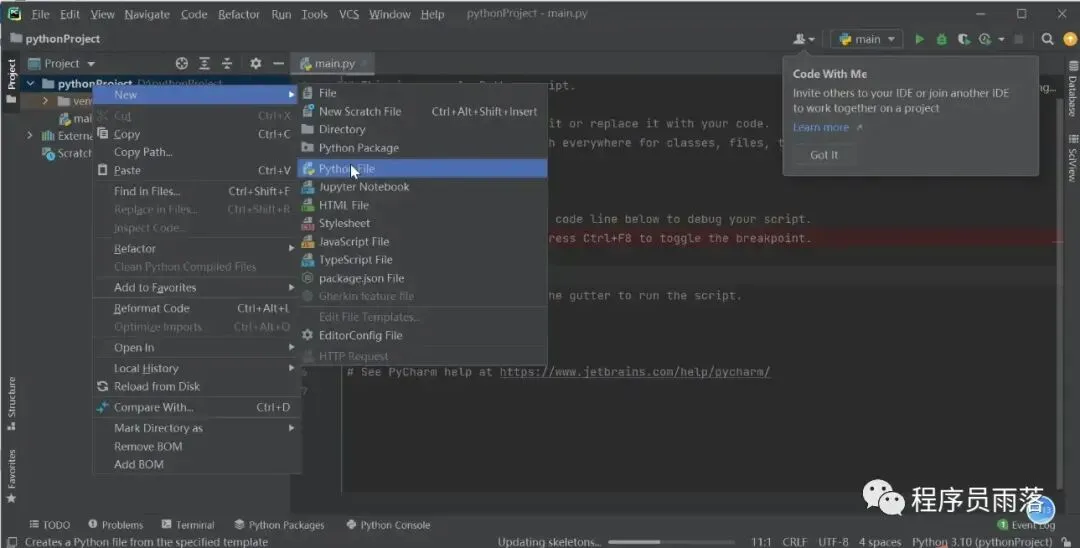 代码演示,测试运行鼠标移到PythonProject,右键New→Python Flie。