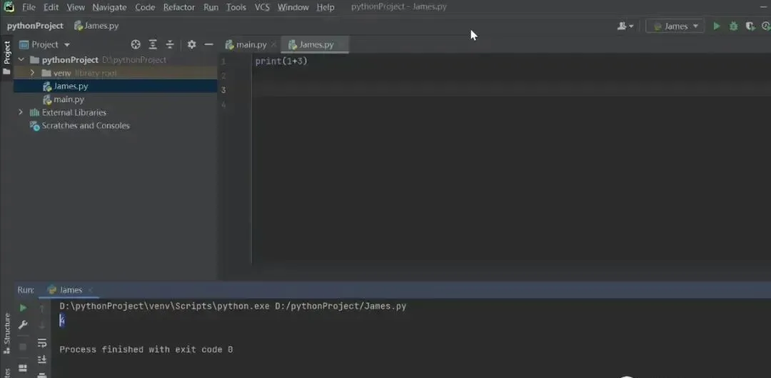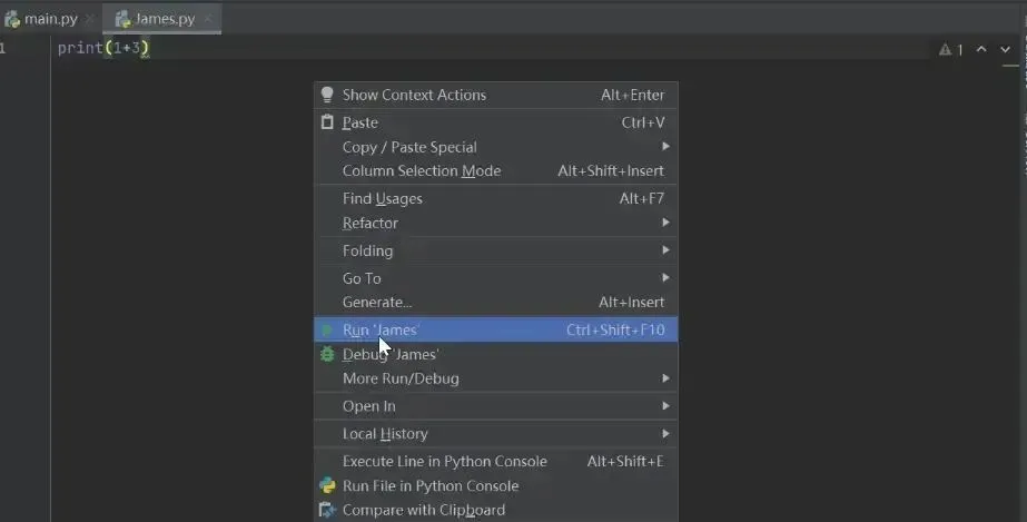 输入代码 Print (1+3)代码试运行,然后在空白处,右键选择 Run ''James",点击程序就可以运行了。