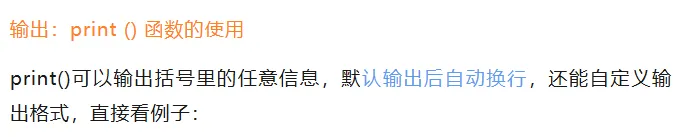 print(123) 直接输出数字,结果:123print('你好', end='') end=''表示不换行,结尾加,结果:你好print('早安', '中国') # 多内容用逗号分隔,输出自动空格,结果:早安 中国s = '测试'; print(s) # 分号隔开,实现一行写多条语句,结果:测试