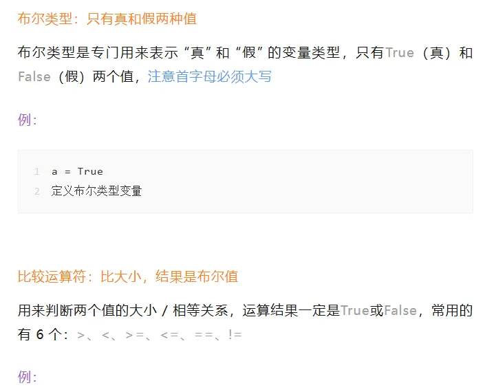 a = 10; b = 5a > b a大于b,结果:Truea < b a小于b,结果:Falsea >= b # a大于或等于b,结果:Truea <= b # a小于或等于b,结果:Falsea == b # a等于b,结果:False(注意是两个等号,一个等号是赋值)a != b # a不等于b,结果:True