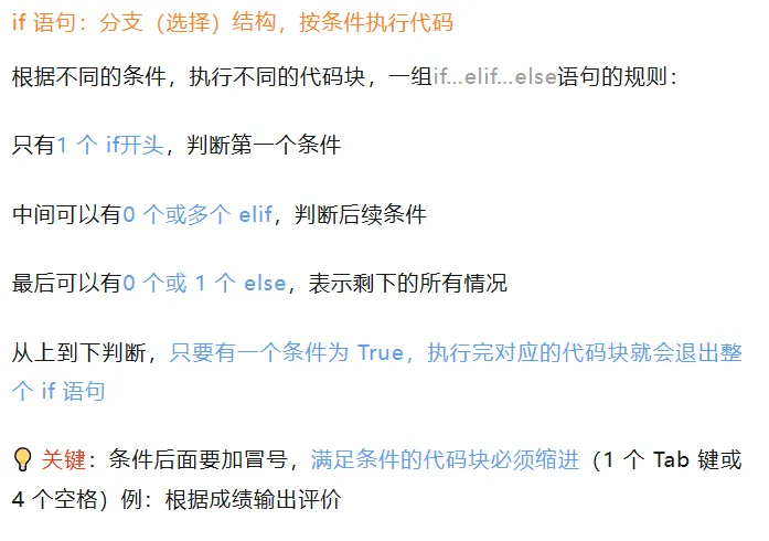 s = int(input('输入数学成绩:')) 输入的字符串转为整型if s < 70 : 分数小于70 print('加油,少年!') # 缩进的代码属于该条件elif 70 <= s < 90 : # 分数70到89之间 print('还有进步空间!')elif 90 <= s <= 99 : # 分数90到99之间 print('学霸同学!')else : # 其他情况(分数≥100) print('超级学霸!!!')