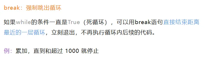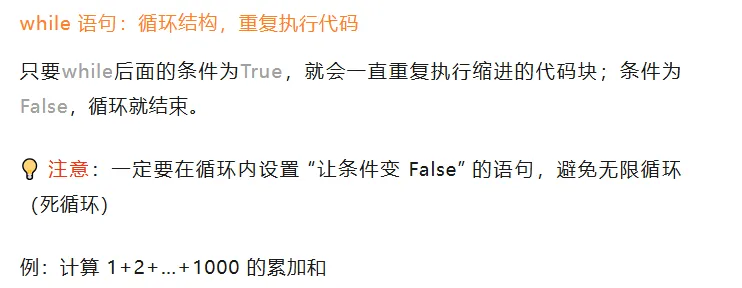 a = 1; s = 0 a初始为1(起始数),s初始为0(存储累加和)while a <= 1000 : 条件:a小于等于1000时,继续循环 s += a # 把当前a的值累加到s中,等价于s = s + a a += 1 # a自增1,让a慢慢变大,最终会超过1000,结束循环print(s) # 循环结束后执行(和while对齐,不缩进),输出累加和