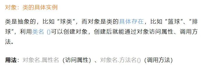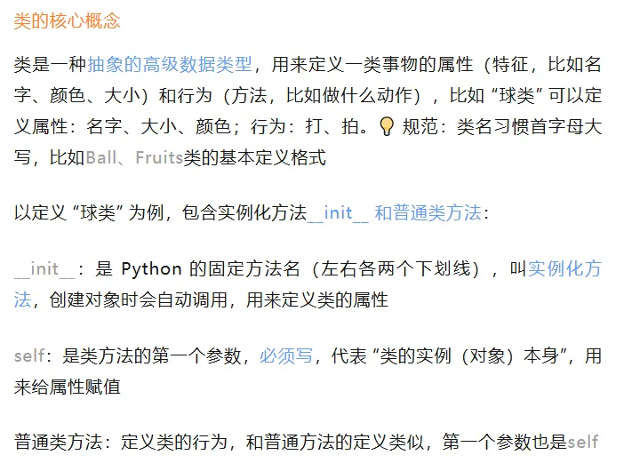 class Ball(): 定义类,类名Ball def init(self): 实例化方法,定义属性 self.name = '篮球' # 定义属性:名字,self.属性名 = 属性值 self.size = '大' # 定义属性:大小 self.color = '棕色' # 定义属性:颜色 def play(self): # 普通类方法,定义行为(打) print('打' + self.name)# 用self.属性名访问类的属性