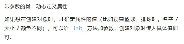 class Ball(): 定义类 def init(self, n, s, c):给实例化方法加3个参数(self必须第一个) self.name = n # 把参数n赋值给属性name self.size = s # 参数s赋值给属性size self.color = c # 参数c赋值给属性color def play(self): # 普通类方法 print('打' + self.name)# 创建不同对象,传入不同参数,动态定义属性b1 = Ball('篮球', '大', '棕色') # 创建篮球对象b2 = Ball('排球', '小', '白色') # 创建排球对象print(b1.color + b1.size + b1.name) # 结果:棕色大篮球b2.play() # 结果:打排球