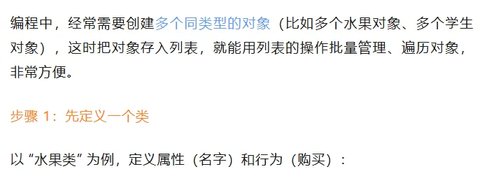 批量添加7个西瓜对象到列表for i in range(1, 8): 循环7次(1到7) fts.append(Fruits('西瓜')) # 每次添加一个西瓜对象# 遍历列表中的所有水果对象for f in fts: # 依次把列表中的对象赋值给f print(f.name, end=' ') # 访问对象的name属性,输出名字,结尾加空格