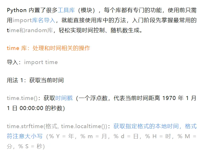 import time 导入time库now = time.time() 获取时间戳print('当前时间戳:', now) # 输出时间戳,例:1661502447.2778742# 输出指定格式的时间print(time.strftime('%Y-%m-%d %H:%M:%S', time.localtime()))# 运行结果,例:2025-12-2413:27:27
