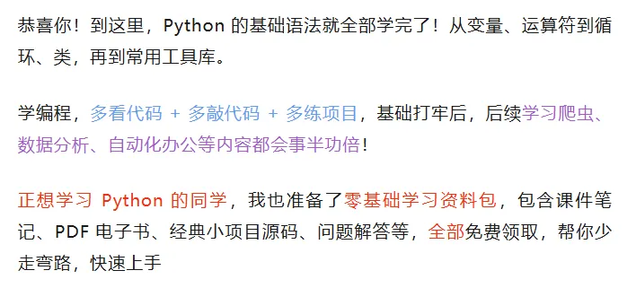 10 天 Python 基础通关攻略(新手专属・学完即实战)这份 10 天 Python 基础通关攻略非常系统,从最基础的变量到类与对象、常用工具库,覆盖了新手入门的核心知识点,而且每天聚焦一个核心模块,非常适合零基础的人循序渐进学习。