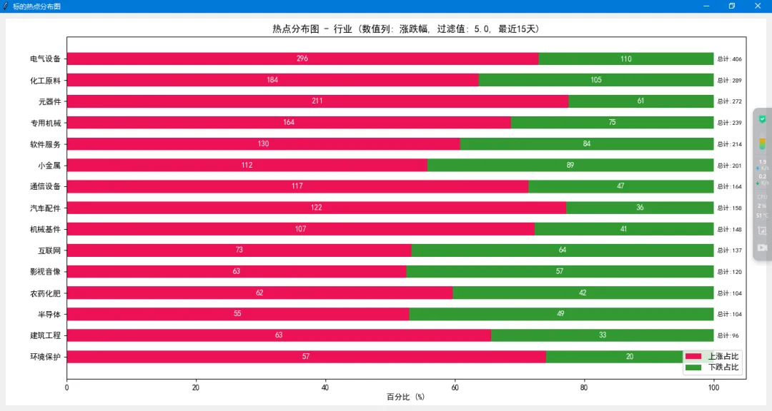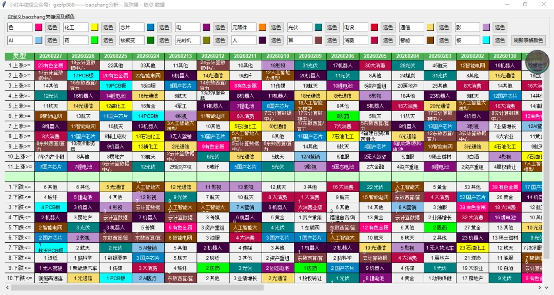 2.热点+申万行业增加了通达信板块+行业:当没有像去年炒海峡西岸+商业航天这样的大级别热点行情的时候,说实在的今年想做热点,但看不到很强的热点持续度,看板块的异动方向的集中度更佳。造成这种的原因,我觉得有几点,1.去年已经发动了不少大级别行情(通信设备的易中天,算力的工业富联,海峡西岸的平潭发展,航天的航字头及飞沃科技等),大a喜欢走走停停,牛少熊多,需要时间缓和消化。2.春节行情基本上都是的躁动,很明显今年的稳指数比市场热点的力度更大(当ai营销,ai应用出头时,市场又是各种降温,行情要想逐渐出头,至少要等一季报+去年年报出来后要更性价比),以下是每天涨跌幅大于+5%或小于-5%对应的分布图,也可以选择均幅,连板数,资金,资金占比参数对应的(热点,申万,板块,行业)分布图。显示格式:数量+(热点,申万,板块,行业)。