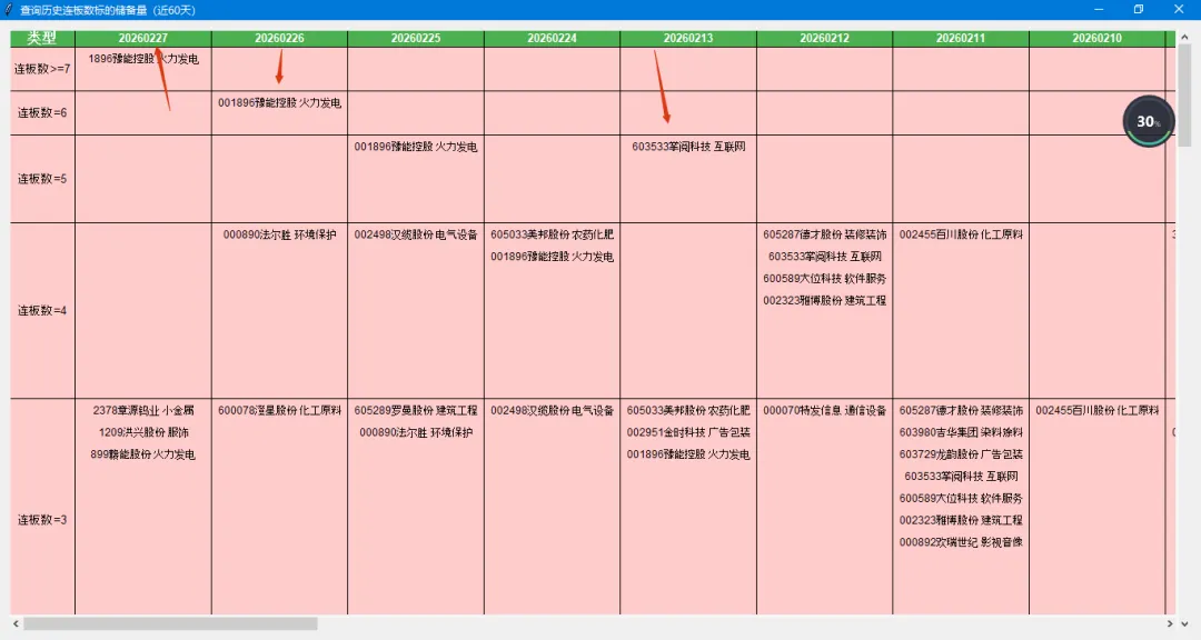 查询历史连板标的:连板储备数量和高度可以反映出市场热点的做多做空的情绪,软件可以下拉,查询被遮挡的连板梯度。复盘的时候可以看到每天二板,三板等标的有哪些,是否具备热点+板块行业的集中度。