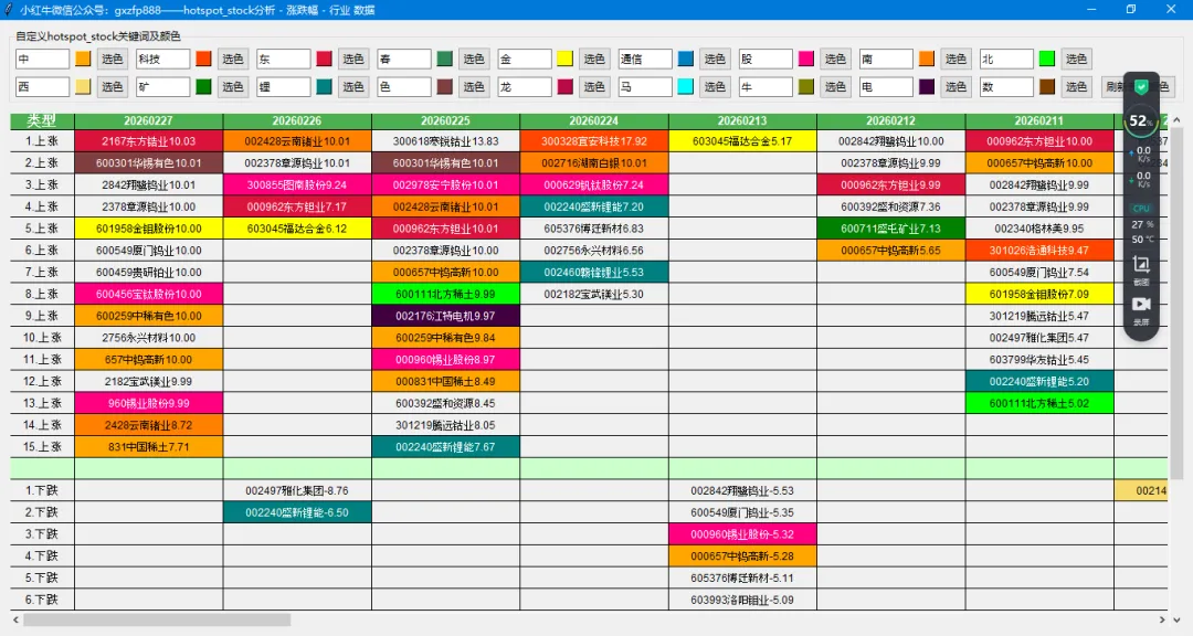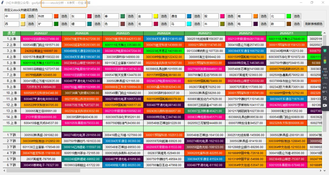 4.后面待优化的空间:使用了一周了,也发现了一些需要优化的地方,比如热点+申万+行业+板块,产生的颜色标记的关键字他们是不一样的,需要独立加载。以及后面结合实战经验,看能不能做更多核心的功能(比如机器学习的应用,分类,聚和等)。目的只有一个效率盯盘,发现问题,解决问题,不断的精简重复,让自己能力提升。有人让我做一个龙虎榜游资的跟踪,我真不想做,以前的话会考虑,可惜当时编程能力不够,加上通达信里面指标分析不能完全满足我的需求,可惜没有早接触Python+ai工具像deepseek也给了我很大的帮助,现在不做的主要原因是这几年龙虎榜没有分析的意义了,真的可以说过时了,上榜的基本上全是量化或垃圾席位,顶级游资用脚指头都能数的过来,有些还是假席位。所以我的复盘思想基本上集中在热点,板块,行业中,独立分析,免得受数据干扰,越看越头大。