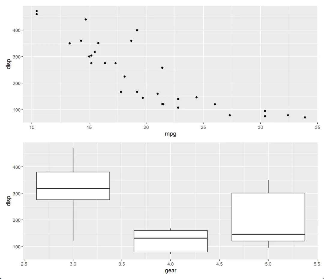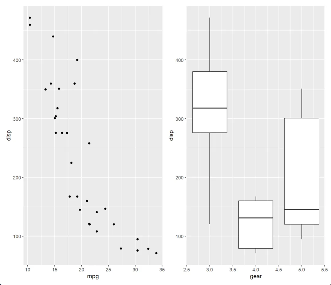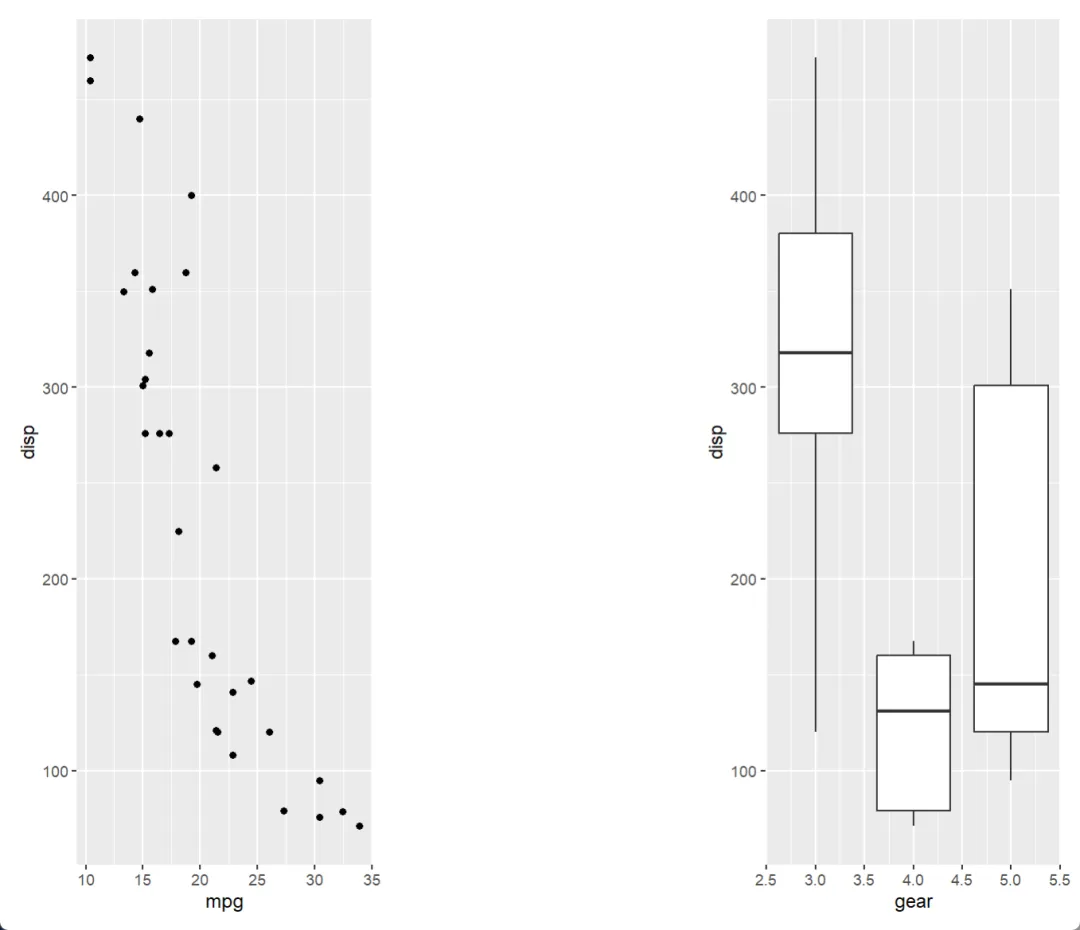 p2 <- ggplot(mtcars) + geom_boxplot(aes(gear, disp, group = gear))
