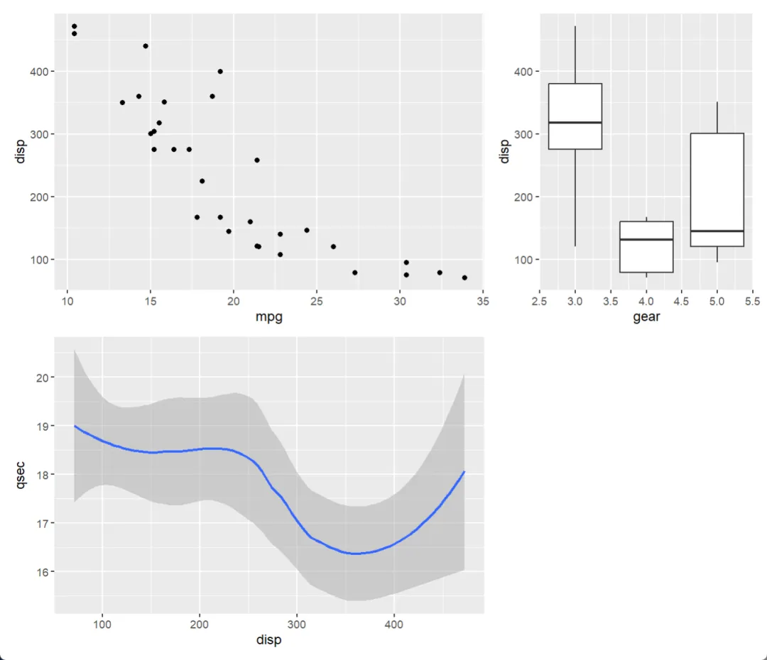 p3 <- ggplot(mtcars) + geom_smooth(aes(disp, qsec))