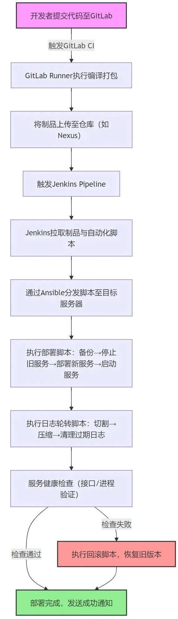 以下通过Mermaid流程图,描绘从代码提交到自动化脚本执行、应用部署完成的全流程,整合GitLab、Jenkins、Ansible与自动化脚本,清晰呈现各环节联动关系。