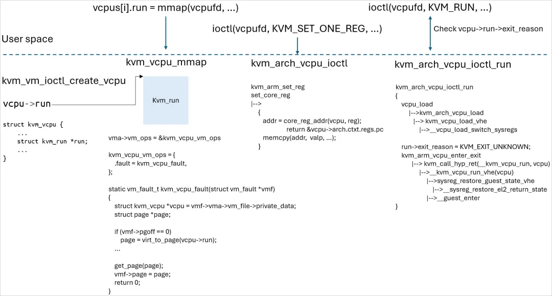 所以在ARM上面,PC是普通意义上的Program Count而不是一个寄存器。在eret返回时候,要执行的代码地址是放在ELR_ELx寄存器,所以在KVM_RUN的过程中,要把regs.pc设置到ELR_EL2中。