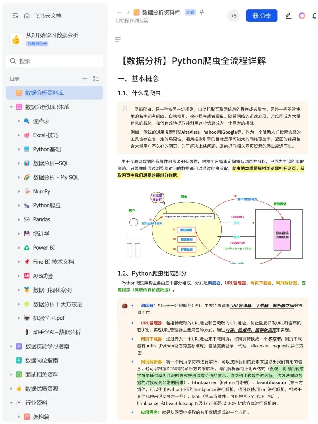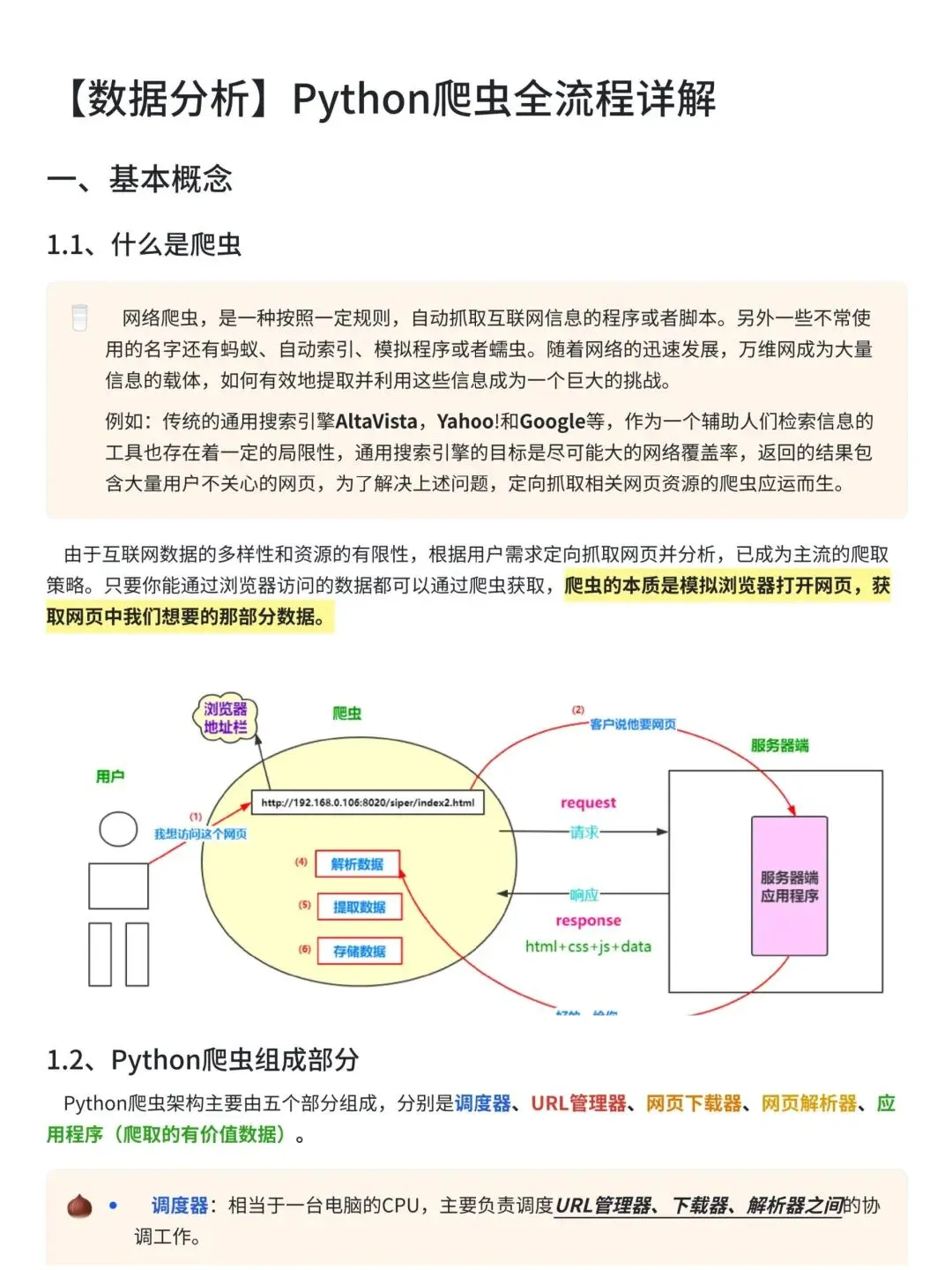 我为大家整理了一份大厂级别的Python爬虫全流程的详细教程手册,帮大家避坑提效,学习效率直接翻倍!这本手册我收录在知识库里了,需要的可以自取!