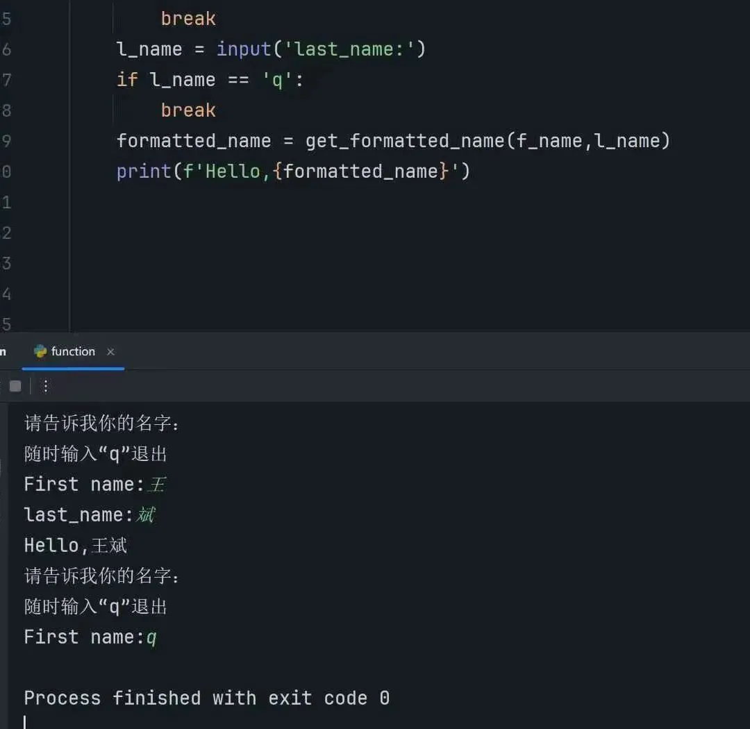 5.print()是两行提示:“请用户输入名字”或“输入q 退出”。