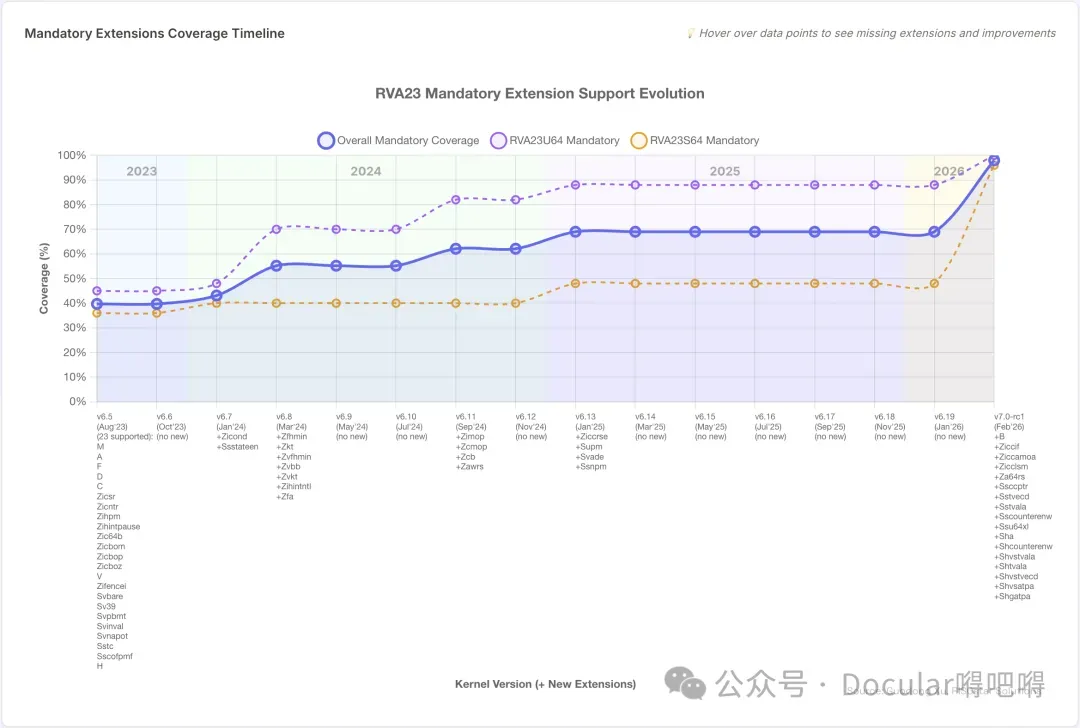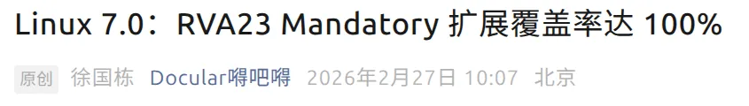 前两天(2026年2⽉22⽇),Linux v7.0-rc1 准时发布。不知道⼤家有没有注意到 RISC-V 架构⽅⾯的⼀个细节:内核对 rva23u64 和 rva23s64 强制(mandatory)扩展的⽀持率,已然达到了 100%。