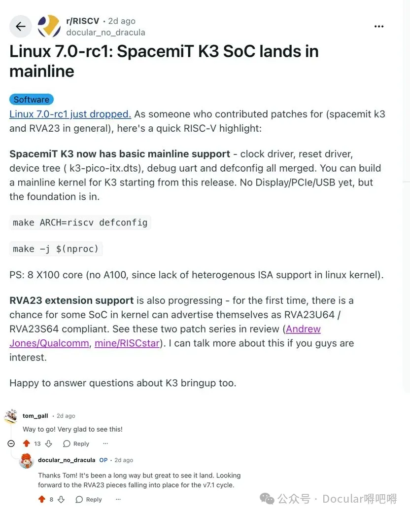 我在 Reddit r/RISCV 上分享了这⼀进展 [4],很快收到了 RISC-V International CTO Tom Gall 的点赞,帖⼦⽬前获得了 60 个 upvote。这说明社区对 RVA23 在 Linux 主线中完整落地这件事⾮常关注 - 它不仅是⼀个技术⾥程碑,也是 RISC-V 软件⽣态⾛向成熟的信号。